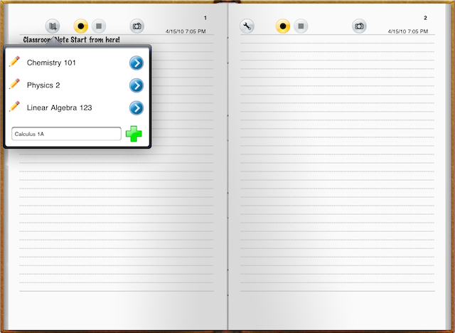 Tap on the first icon on the top, enter the course name, tap the Green + button. 100 notebook page will be created and bookmarked. You can jump to that notebook by tap the arrow key on this popup.