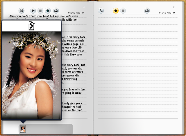 Feature Highlight ✓ Use finger to turn page next or previous ✓ A real notebook for classroom ✓ the ability to create multiple notebooks for different classes. ✓ Record voice memo while writing your notes ✓ Add picture or your own drawing to the notes ✓ Change notebook paper style and text font ✓ Create PDF book for your notesIt is the replacement for any paper notebook. This notebook has much more other feature such as records voice memo on each page and associates many pictures with the page. It also allows the user to change the notebook paper styles. Moreover, you can generate a pdf version for all your notes and send to your email.