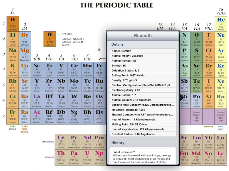 News: This app supports iPad natively with full width and height.- No network connection needed. - Easy to zoom in and out periodic table with two fingers - Show details description and history about certain element - Show many physical properties of an element such as oxidation states, density, electron configuration, thermal conductivity and more. - A tool help all students memorize the elements - A important reference for any student who studies chemistry. - A important referenece for anyone in chemistry field. - Easy and simple to use.